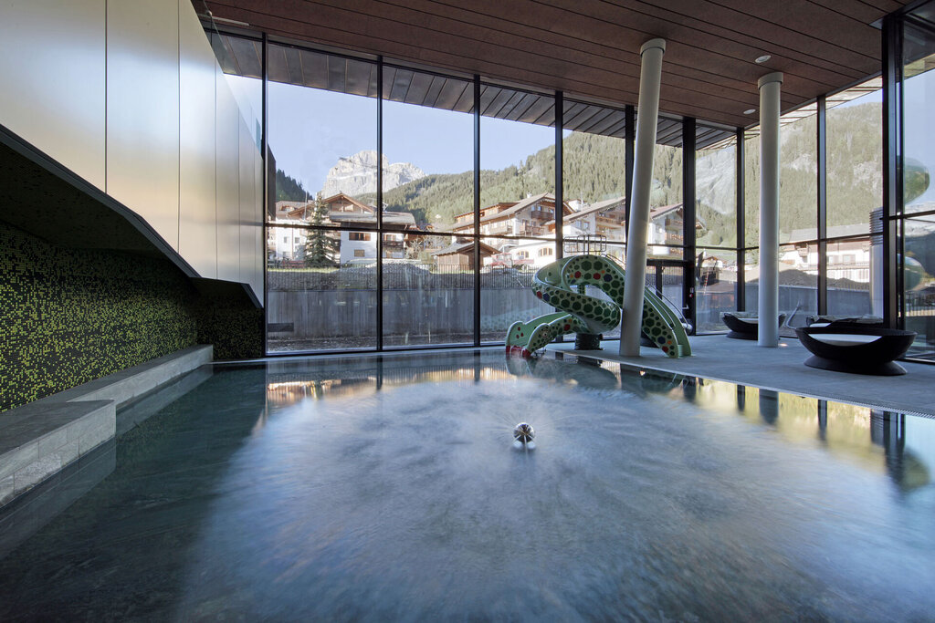 The aquatic centre covers a total area of 2,400 square metres and offers the opportunity to swim, have fun and relax in the heart of Canazei, with panoramic views of the peaks of Gran Vernel and Colac. It is divided into four thematic areas: Water & Fun (swimming pools), Eghes Wellness (wellness), Sport & Fitness (gym) and Eat & Drink (refreshment point). You absolutely have to try them all!