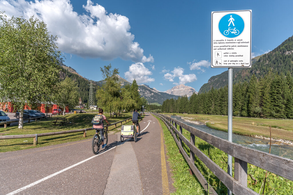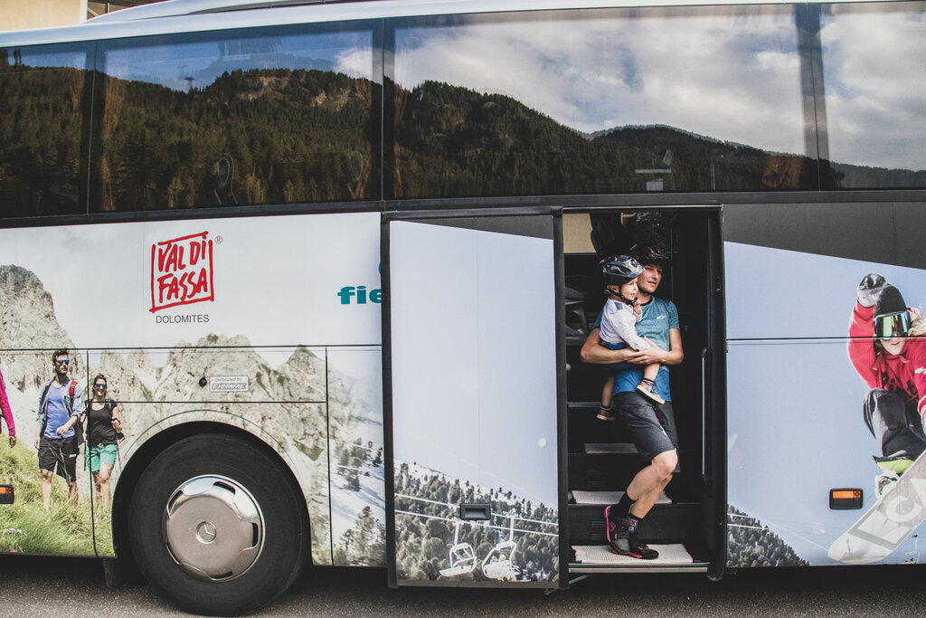 A bus takes cyclists who ride down the cycle path from Alba di Canazei to Molina di Fiemme back to Val di Fassa.
