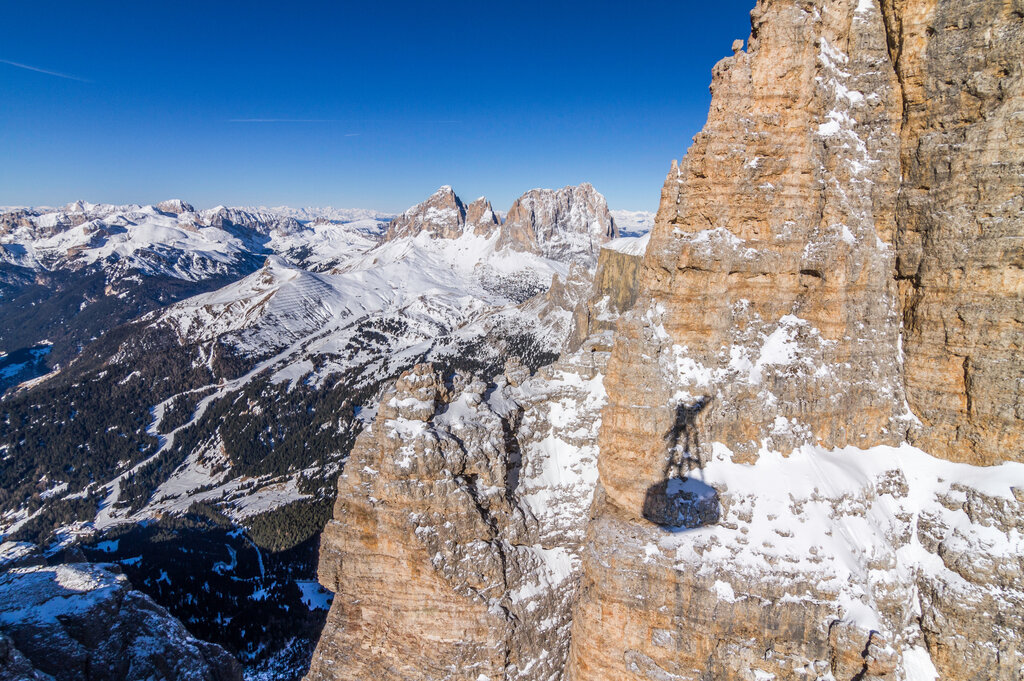 At the arrival of the cable car that goes up from the Pordoi Pass (2239 meters) to the Sass Pordoi (2950 meters), there is the Rifugio Maria with its famous Terrace of the Dolomites.