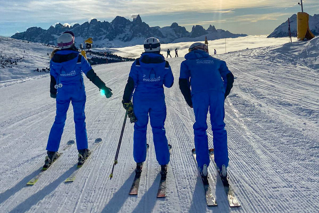 The lessons take place in the ski areas Alpe Lusia-Bellamonte (meeting point at the intermediate station of the cabin lift "Valbona") and San Pellegrino Pass-Falcade (meeting point at the valley station of the chairlift "Costabella" or of the chairlift "Gigante"). Courses available in: Italian, English, German. Ski helmet and insurance are mandatory. Rental service directly at the headquarters of Moena.