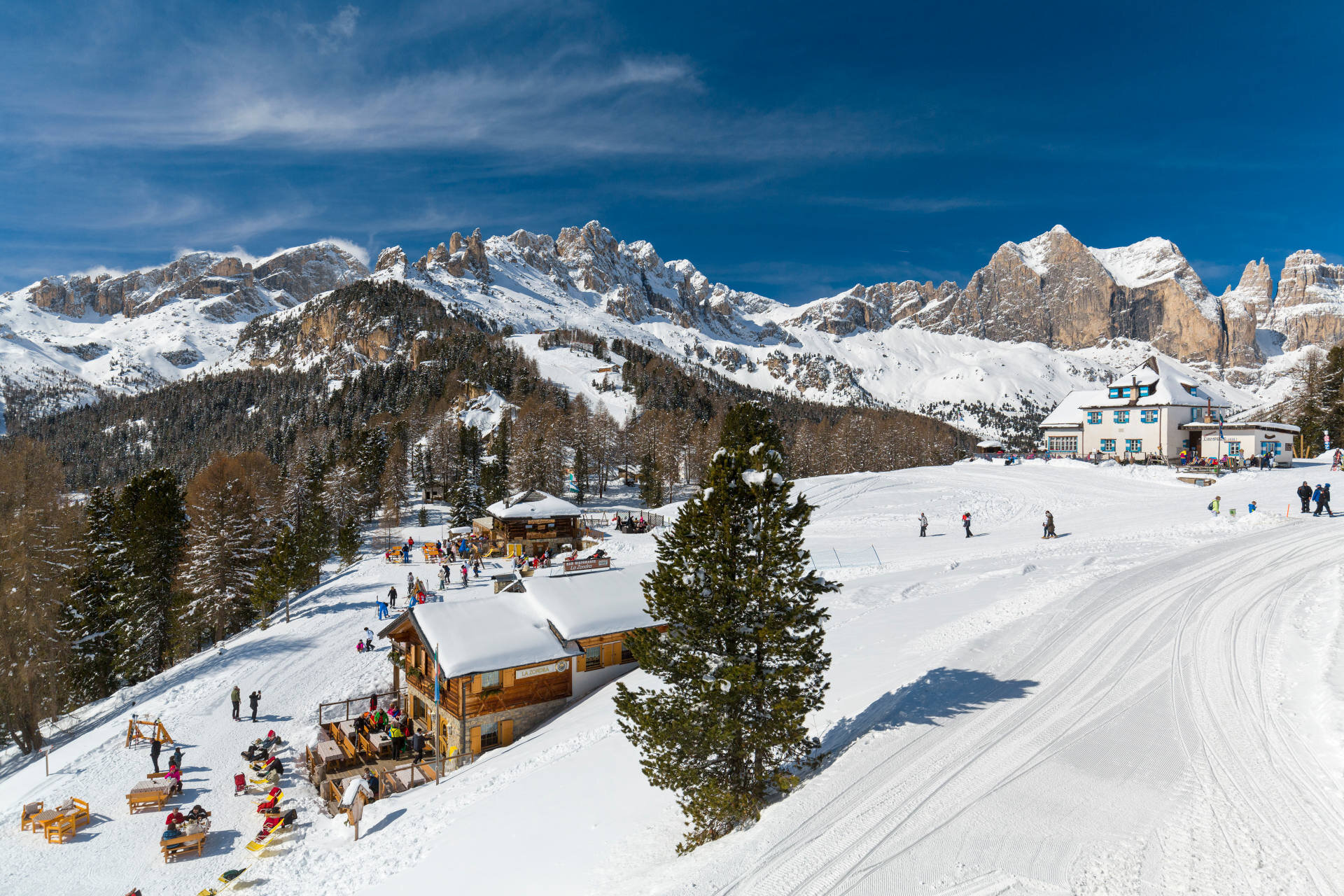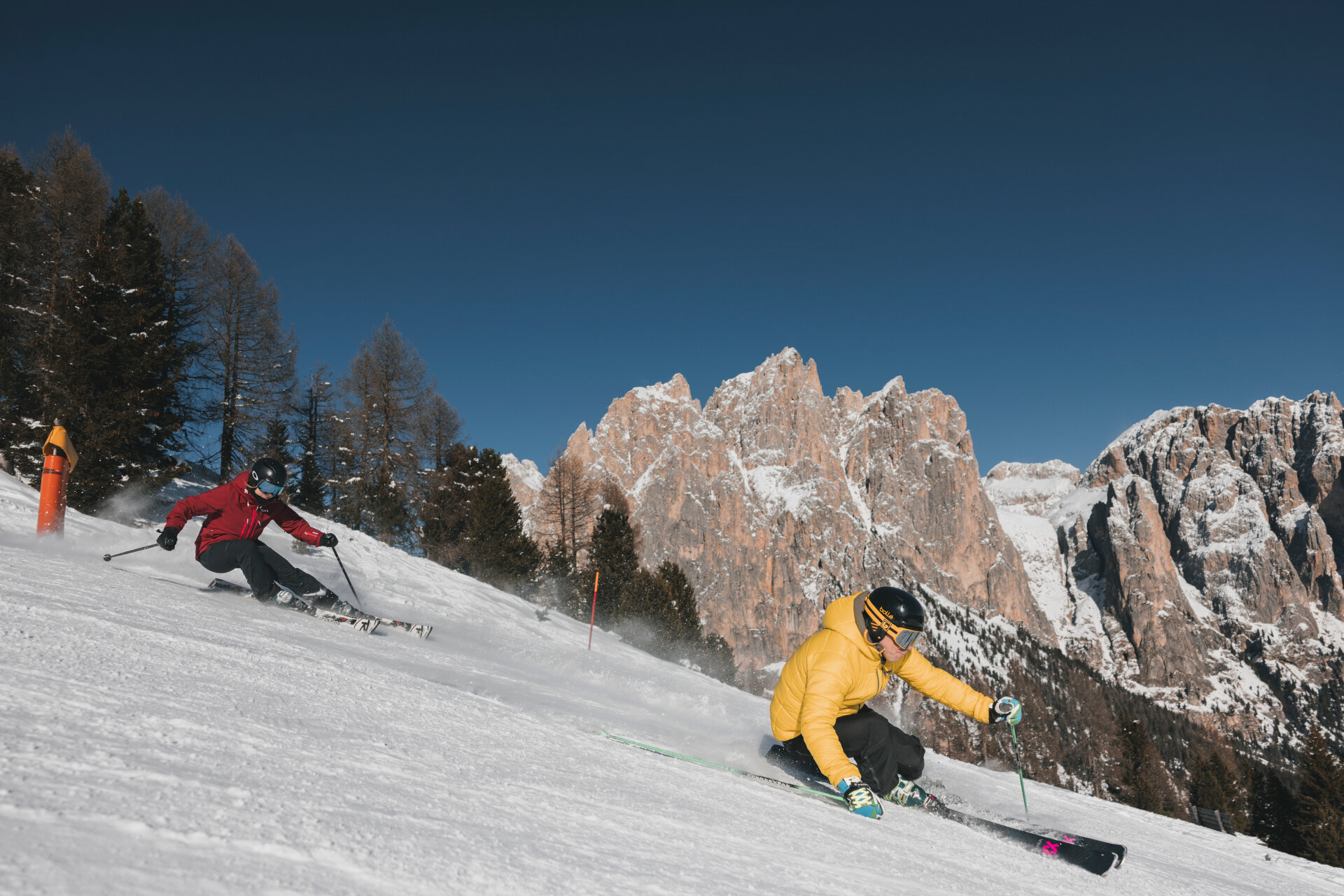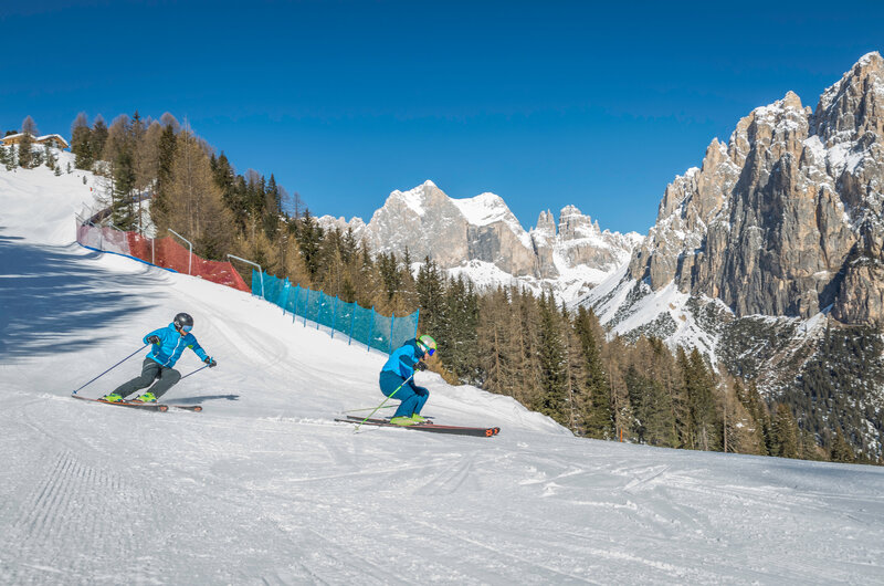 The black Tomba slope - 900 m long, with a 300 m vertical drop and gradients of up to 59% - is dedicated to the legendary skier who trained for years in the Ciampedie basin, beneath the shadow of the Catinaccio-Rosengarten. From the very first steep zigzags, it’s evident that this descent is reserved for true snow professionals capable of "taming" the hard-packed snow walls and sudden changes in gradient. In the final section, the slope eases and flows smoothly down to "Pian Pecei" and the valley station of the chairlift that shares its name.