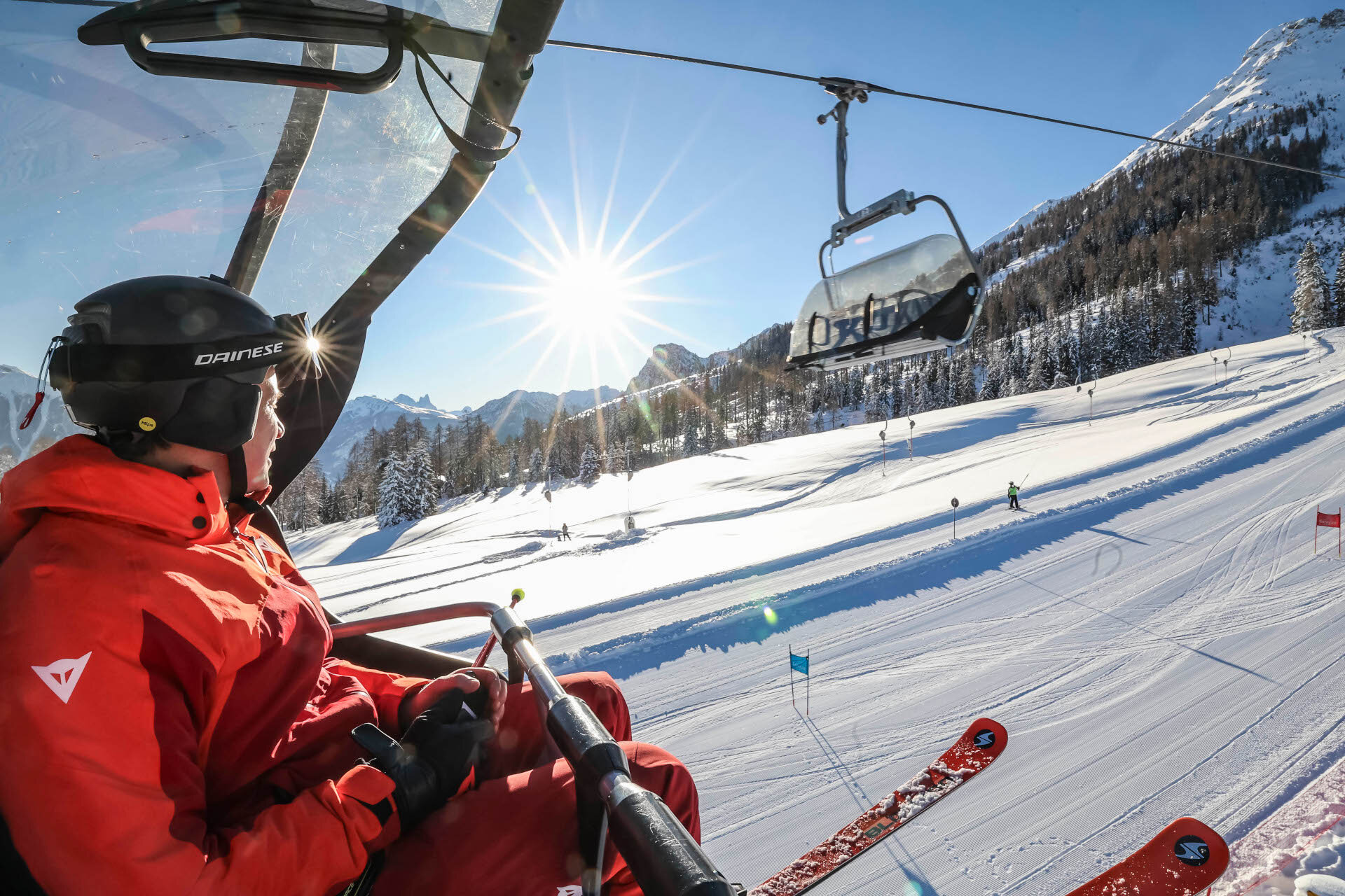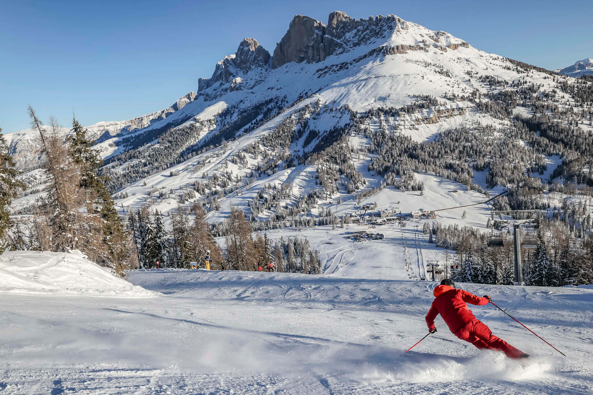 The Roda de Vael and the Majarè ridge loom up in front of you as you tackle a wide and beautiful slope that, after the initial part, literally swoops down. Take a good look at the changes of gradient on the piste, which for years has hosted a parallel giant slalom snowboard World Cup competition. At the end, when you can widen your curves and look up, you find breathtaking peaks ahead.